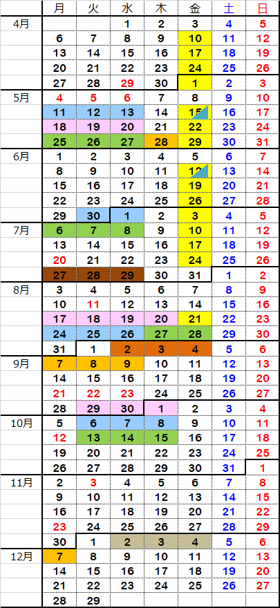 「実践食料生産」のスケジュールをお知らせします(下記のうち色のついた日に実習が行われます)。「農場から食卓まで」等のその他のプログラムは、休日を含め希望日に開講しますので、まずはお問い合わせください。
