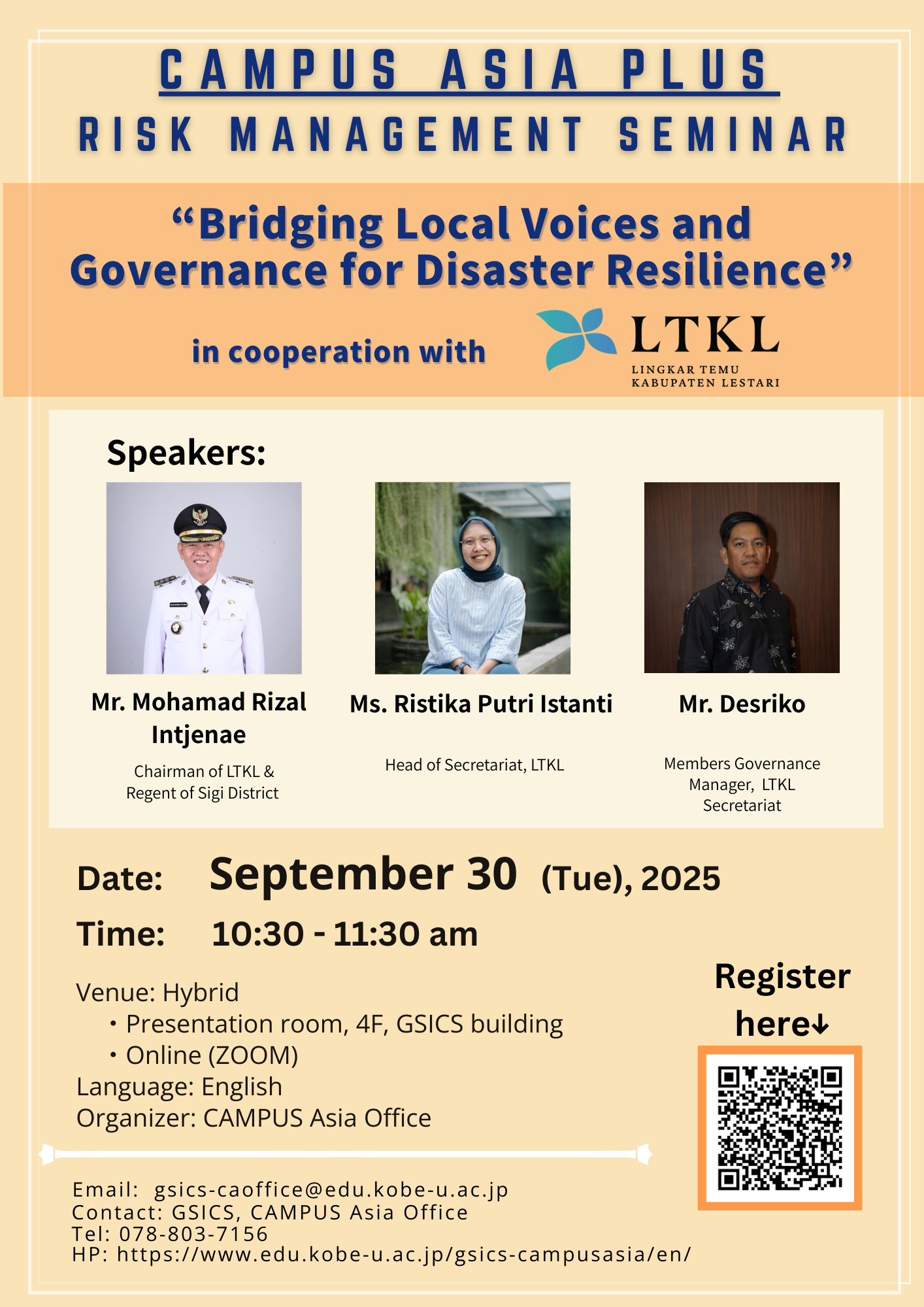 Kobe University’s CAMPUS Asia Plus Program will offer Risk Management Seminar Series from leading experts, including current/ former experts from United Nations and other international organizations, policymakers of various UN Member States and researchers.
