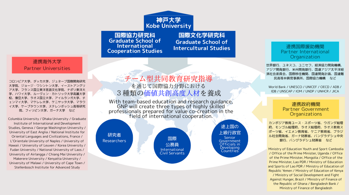 博士後期課程の学生を対象に、国際協力研究科と国際文化学研究科が海外大学、国際援助機関、途上国政府機関と連携し、「グローバルネットワーク型共同教育研究プログラム」を構築・発展させることでチーム型教育研究指導を実現し、国際協力の最前線で活躍できる「価値共創高度人材」を養成することを目的としています。