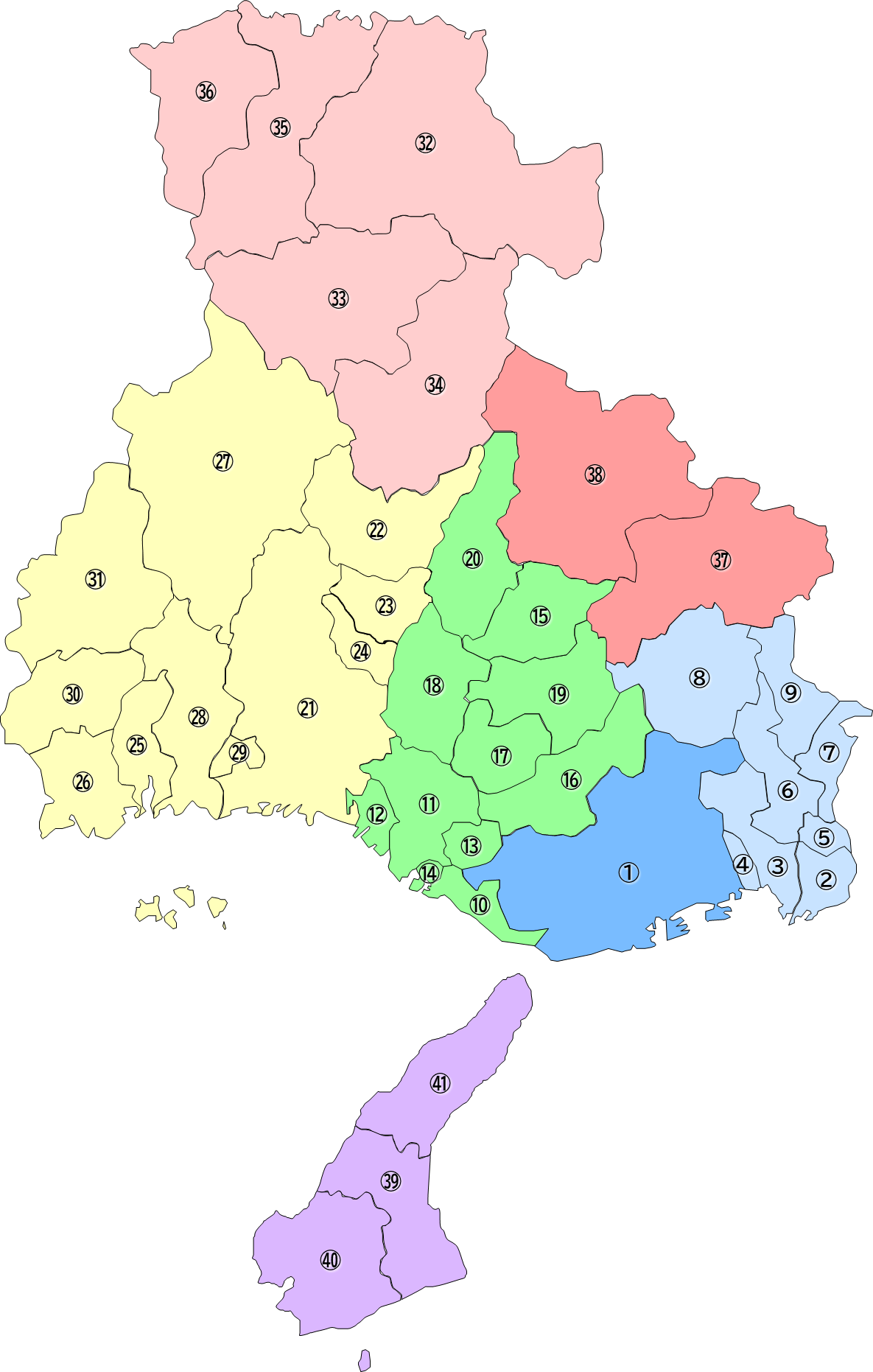 ① 神戸市 ② 尼崎市 ③ 西宮市 ④ 芦屋市 ⑤ 伊丹市 ⑥ 宝塚市 ⑦ 川西市 ⑧ 三田市 ⑨ 猪名川町 ⑩ 明石市 ⑪ 加古川市 ⑫ 高砂市 ⑬ 稲美町 ⑭ 播磨町 ⑮ 西脇市 ⑯ 三木市 ⑰ 小野市 ⑱ 加西市 ⑲ 加東市 ⑳ 多可町 ㉑ 姫路市 ㉒ 神河町 ㉓ 市川町 ㉔ 福崎町 ㉕ 相生市 ㉖ 赤穂市 ㉗ 宍粟市 ㉘ たつの市 ㉙ 太子町 ㉚ 上郡町 ㉛ 佐用町 ㉜ 豊岡市 ㉝ 養父市 ㉞ 朝来市 ㉟ 香美町 ㊱ 新温泉町 ㊲ 丹波篠山市 ㊳ 丹波市 ㊴ 洲本市 ㊵ 南あわじ市 ㊶ 淡路市 |