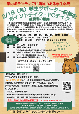 キャンパスライフ支援センターで2月18日に、学生の皆さまに向けた「ポイントテイク・PCテイク研修会」を開催いたします。