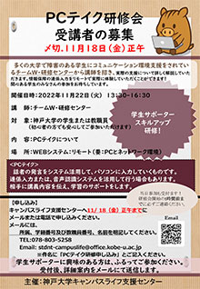 キャンパスライフ支援センターが主催し、ZOOMを利用して、PCテイクについて学ぶ研修会を行います。