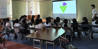 2日目の午前は、カンボジアとバングラデシュ出身の大学院生が自国の現状と課題を英語で紹介し、生徒との対話を通して相互理解を深めました。午後から3日目にかけては、生徒たちが7つのグループに分かれ、関心のある国とテーマを選び、現状分析および課題解決策の提案に取り組むグループワークを行いました。各グループには留学生がメンターとして加わり、英語でのディスカッションや情報収集をサポートしました。