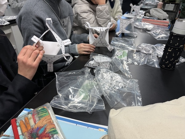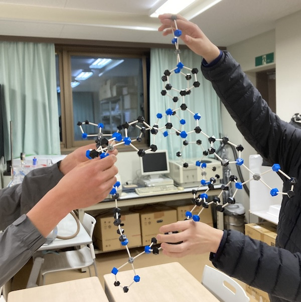 - 実際に分子模型を作ることで、安定した分子構造が一つに決まるということや、一度分子同士で繋がってもすぐに離れることがあるということが分かりました。また、穴が空いている分子が注目されつつある理由についても知ることができたと思います。(3年生)