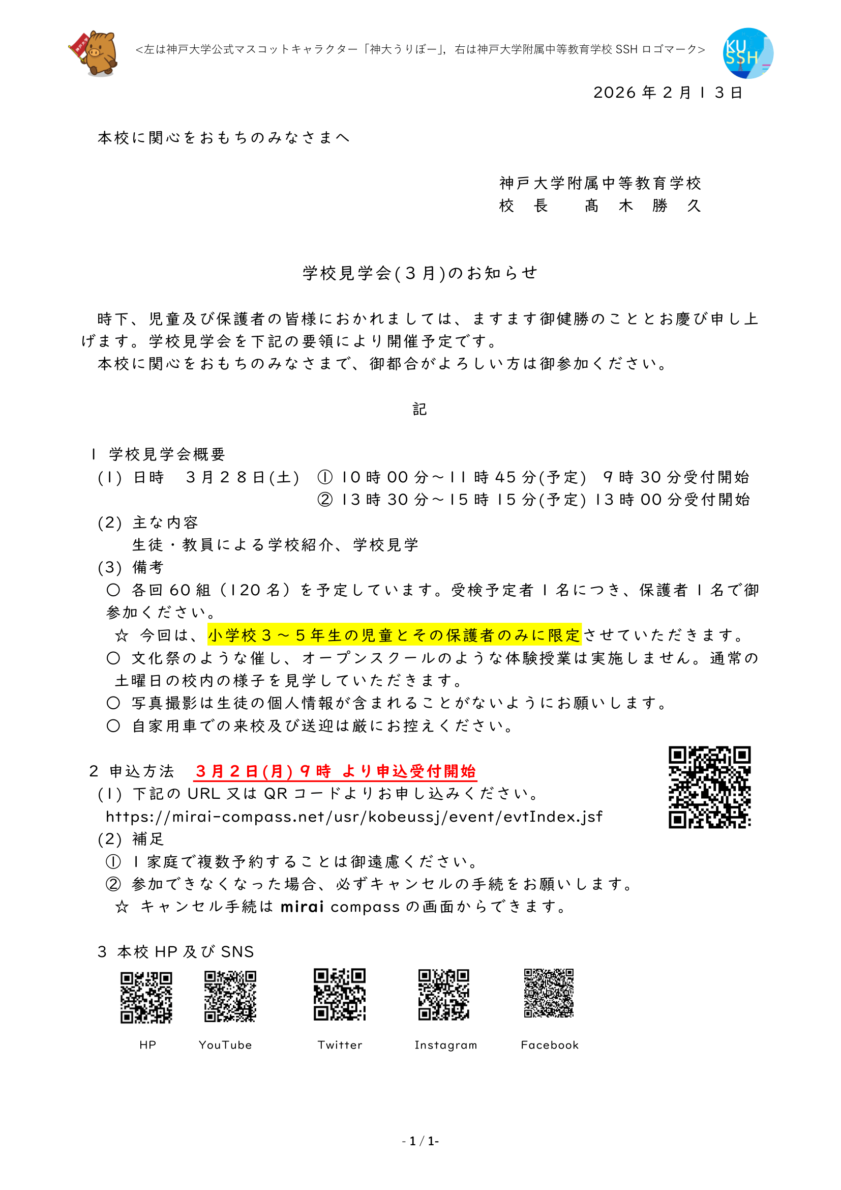 生徒と教員による案内により、校内を見学していただきます。全体で90分程度の予定です。オープンスクールとは異なり、体験授業、部活動体験、卒業研究発表等はありません。