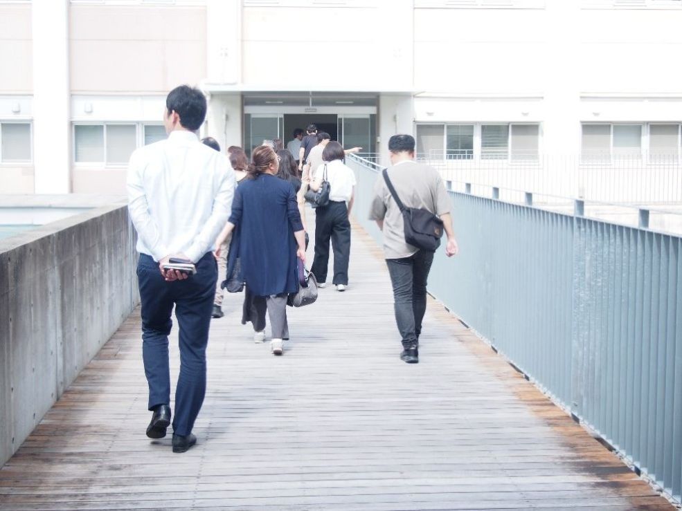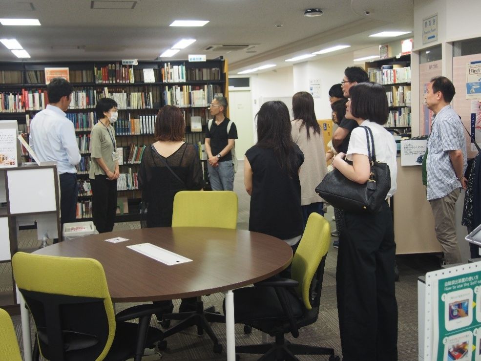 学生ラウンジ、コモンルーム、共同談話室、教室、演習室、ウッドデッキ、プレゼンテーションルーム、図書館(書庫、閲覧室、ラーニングコモンズ)を案内し、説明を行いました。