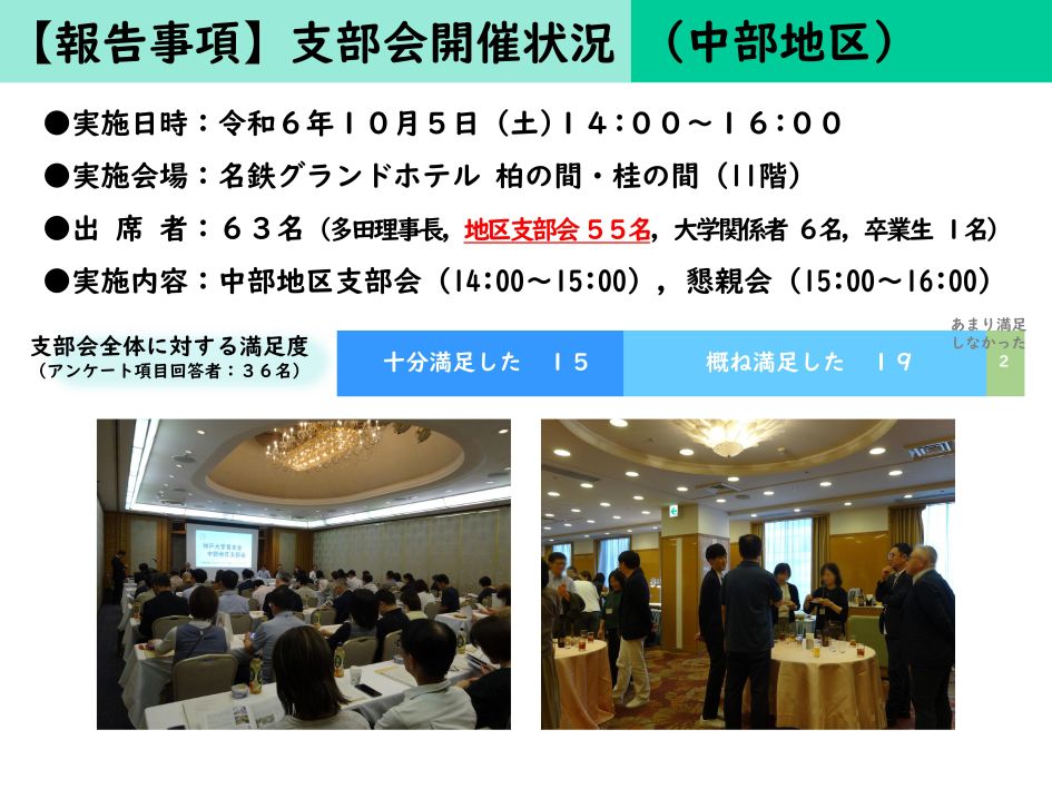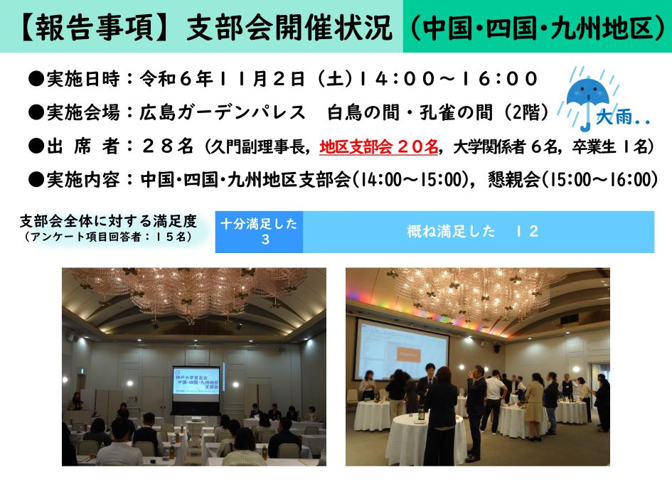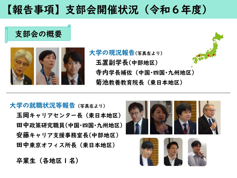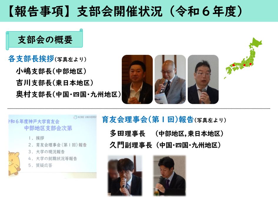 各地区の支部会にご出席いただいた玉置副学長をはじめとする大学の先生方から入学者の状況や学部・学科の新設、グローバル教育などに関する神戸大学の現況について、また、玉岡キャリアセンター長をはじめとする関係教職員の方々から就職状況等について、それぞれ貴重な情報をご説明いただきました。加えて、各支部に卒業生を1名ずつ招聘し、学生生活や就職活動、就職後の状況など直接ご本人からお話を伺うことができました。中部地区及び東日本地区では多田理事長が、また、中国・四国・九州地区では久門副理事長が、6月に開催した第1回理事会の報告をいたしました。