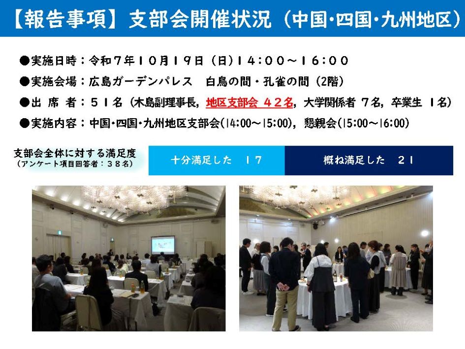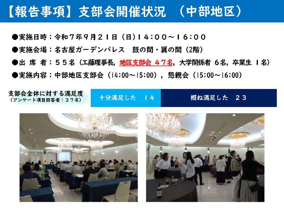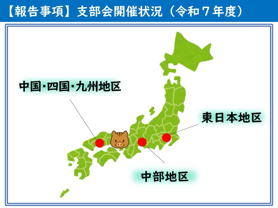 中部地区及び東日本地区では工藤理事長が、また、中国・四国・九州地区では木島副理事長が、6月に開催した第1回理事会の報告をいたしました。