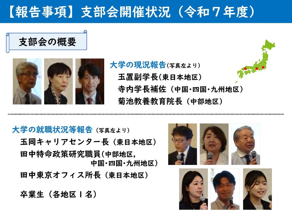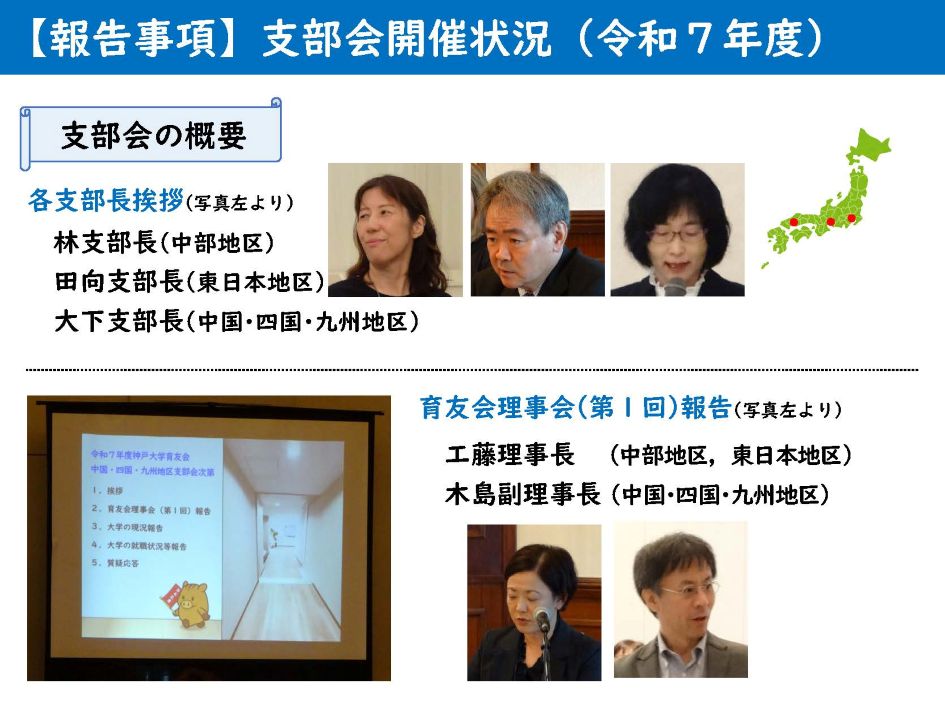 各支部会にご出席いただいた、玉置副学長をはじめとする大学の先生方から、入学者の状況やグローバル教育、これからの大学教育などに関する神戸大学の現況について、また、玉岡キャリアセンター長をはじめとする関係教職員の方々から就職状況等について、それぞれ貴重な情報をご説明いただきました。